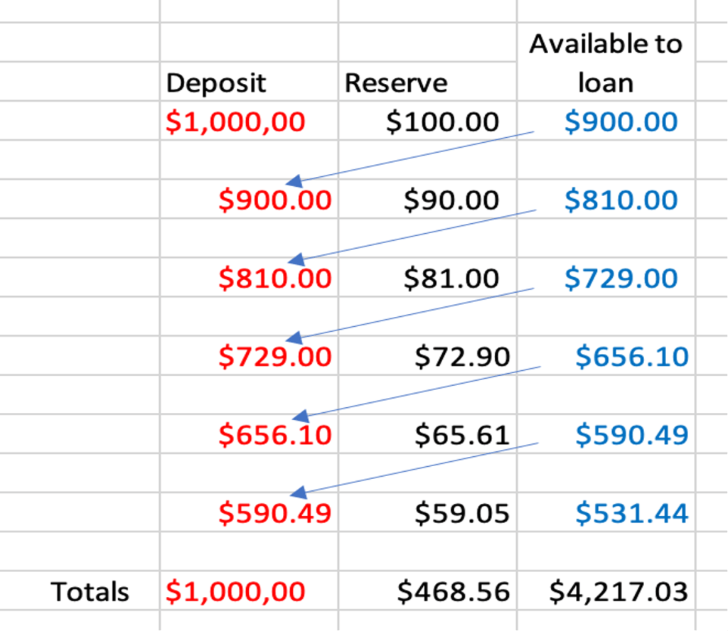 As the chart shows, based on an original deposit of $1,000.00, the bank could loan out over $4,000.00 while holding only $468.56 in reserve. Nice work if you can get it.